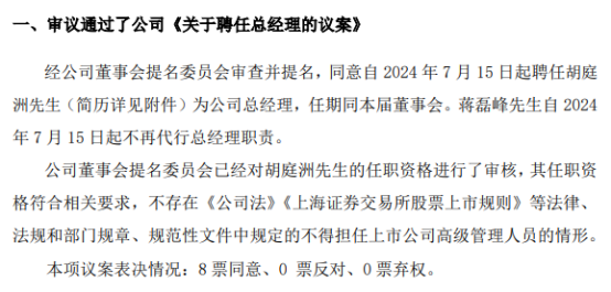 2024年7月12日,水井坊发布公告,自7月15日起聘任胡庭洲为公司总经理。同时,水井坊法定代表人由蒋磊峰变更为胡庭洲。这已经是是自帝亚吉欧入主以来,第八位上任的总经理了(包括代行总经理)。