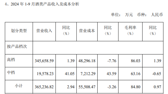 2024年1-9月,水井坊高档产品的增速远远低于中档产品。报告期内,公司高档产品营收34.57亿元,同比增长1.39%;中档产品营收1.96亿元,同比大涨41.05%。