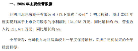 水井坊称,全年来看,公司收入与利润均较上一年度保持增长,完成了年初制定的全年经营目标。